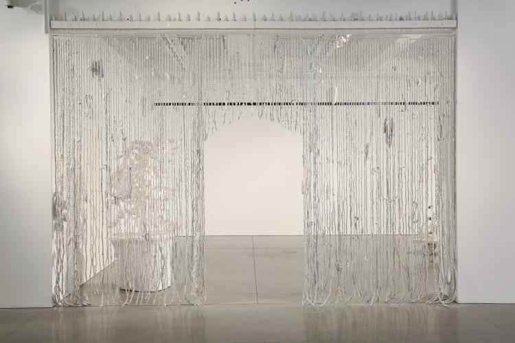 The piece titled, If there is a Paradise, Surely it is Here, is a beaded curtain consisting of handmade porcelain beads. Both delicate and massive, the curtain stokes the senses. If you don't hear the clanging of the beads in the wind first, you are immediately brought into the piece by it's shear presence. The curtain invites you to walk through the archway cut out of the center, giving the viewer a sense of entering into a new space.