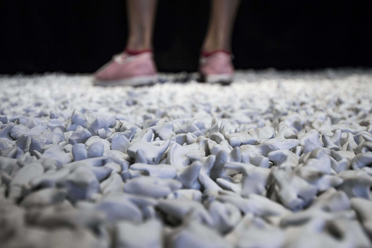 Christine Hudson covers an area of the floor with over one hundred thousand handmade porcelain teeth, intended to be traversed by foot. By crossing this sea of ceramic works and reading the artist statement, the work offers understandings relative to personal grief and discomfort.