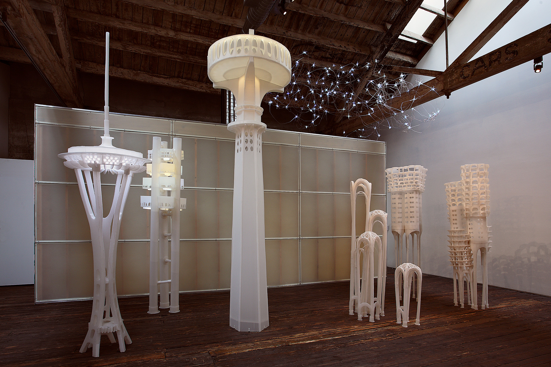 Camelot is a ghost city. In the mash-up of urban architecture, buildings from different cities, some misremembered or out of scale, some hybrids of two or more towers, and some ghosts of buildings that have been torn down or were never actually built share space in a luminous landscape that resonates with the memories of cities in the visitor’s mind. The installation was originally created for Tom Bradley International Terminal at LAX Airport in response to the unique state of mind of travelers in a disoriented limbo, a state that the artist considers dreamlike and poetic. For PUMP, Aschheim is installing Camelot in a conversation with some other sculptural meditations on Twentieth Century modernist architecture to bring to life a shifting personal geography of memory.